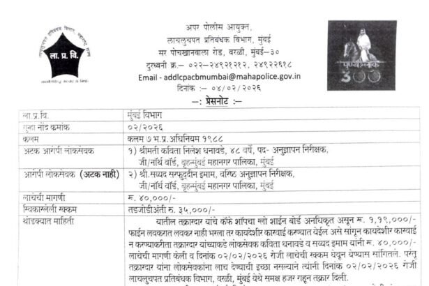 🗞️ ACB की बड़ी कार्रवाई: BMC के दो अधिकारियों पर रिश्वत मांगने का मामला दर्ज.......... मुंबई | प्रतिनिधि मुंबई महानगरपालिका के जी/नॉर्थ वॉर्ड में कार्यरत दो वरिष्ठ अधिकारियों…