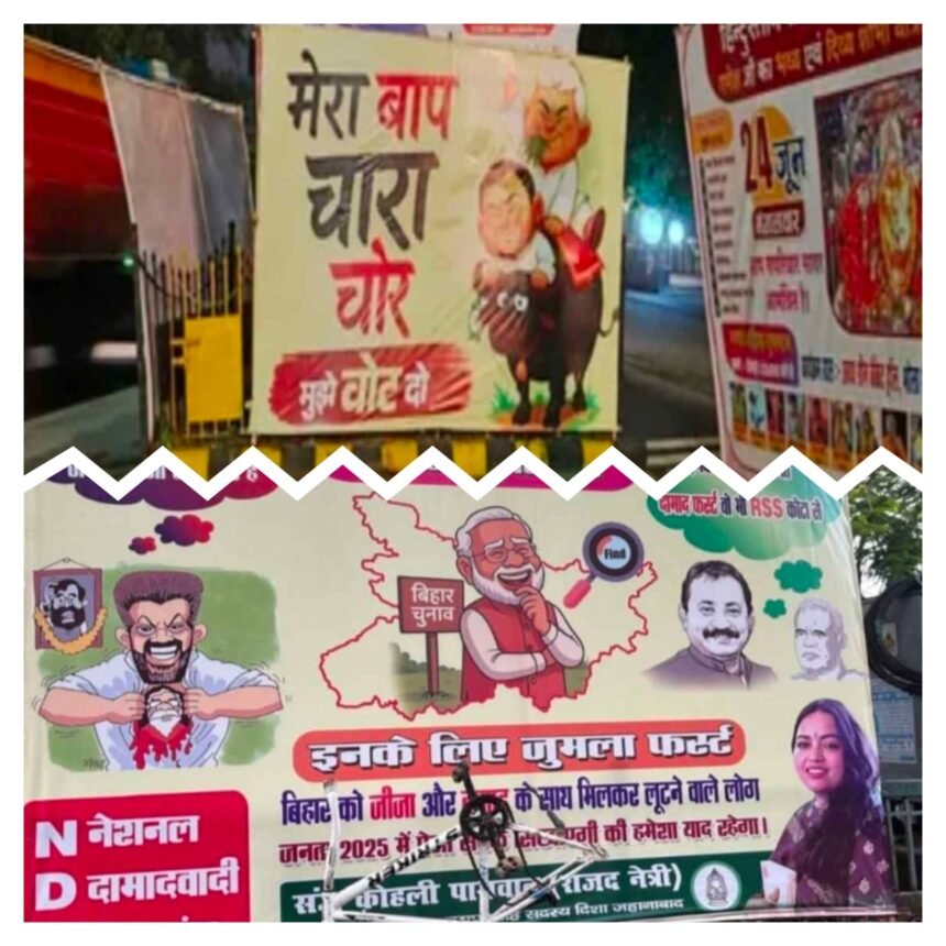 बिहार की राजधानी पटना में पोस्टर युद्ध! …तेजस्वी के पोस्टर में लिखा मेरा बाप चारा चोर है, चिराग को बताया जीजा फर्स्ट …एनडीए का मतलब नेशनल दामादवादी अलायंस………….
