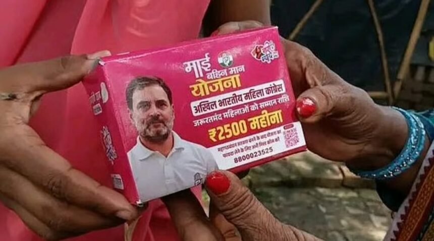 कुमार ने सैनिटरी पैड का एक सैंपल पैक दिखाया, जिस पर लिखा था, “माई-बहन मान योजना (माँ-बहन सम्मान योजना), अखिल भारतीय महिला कांग्रेस। जरूरतमंद महिलाओं के लिए वित्तीय सहायता – ₹2,500 प्रति माह।”