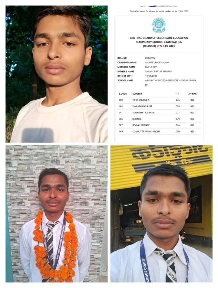 उत्तर प्रदेश के गोंडा जिले की धानेपुर इलाके की ग्राम पंचायत राजपुर के रहने वाले अमन कुमार मौर्य ने मंगलवार को सीबीएसई की ओर से घोषित बोर्ड परीक्षा परिणाम में हाई स्कूल में उन्होंने 97.6% अंक हासिल कर इतिहास रच दिया है। जिस पर उन्हें बधाइयां मिल रही है। उन्होंने सफलता का श्रेय अपने माता-पिता और गुरुजनों को दिया है।