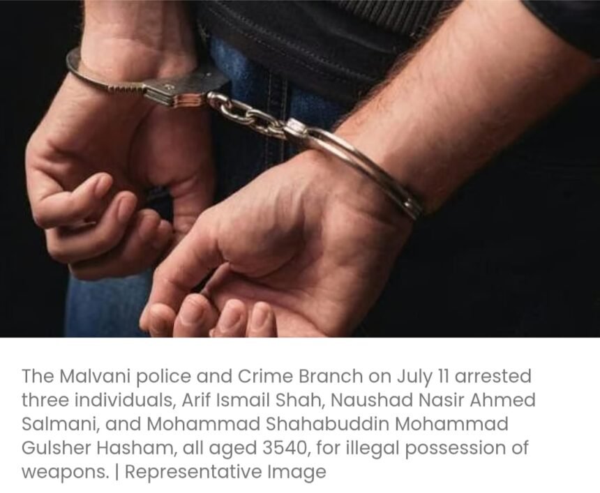 मुंबई: मालवणी पुलिस और क्राइम ब्रांच ने 11 जुलाई को 35-40 साल की उम्र के तीन लोगों, आरिफ इस्माइल शाह, नौशाद नासिर अहमद सलमानी और मोहम्मद शहाबुद्दीन मोहम्मद गुलशेर हाशम को अवैध हथियार रखने के आरोप में गिरफ्तार किया। तीनों के पास से एक देसी पिस्तौल, दो देसी चाकू और छह ज़िंदा कारतूस बरामद किए गए, जो कथित तौर पर मुंबई में हथियार बेचने की कोशिश कर रहे थे।