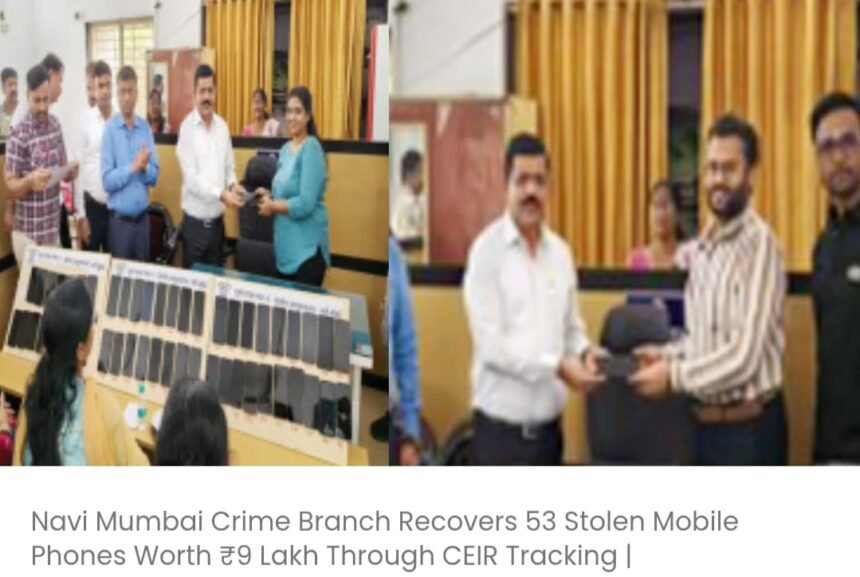 नवी मुंबई क्राइम ब्रांच ने सेंट्रल इक्विपमेंट आइडेंटिटी रजिस्टर (CEIR) पोर्टल के माध्यम से तीन महीने तक चलाए गए अभियान के बाद लगभग ₹9 लाख मूल्य के 53 चोरी हुए और गुम हुए मोबाइल फोन बरामद कर नागरिकों को लौटा दिए हैं।